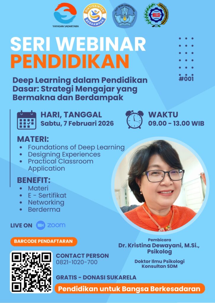 Melalui webinar ini, para pendidik akan diajak memahami dan mempraktikkan Deep Learning dalam Pendidikan Dasar: Strategi Mengajar yang Bermakna dan Berdampak, sebuah pendekatan pembelajaran yang menempatkan siswa sebagai subjek belajar yang aktif, reflektif, dan berkesadaran.